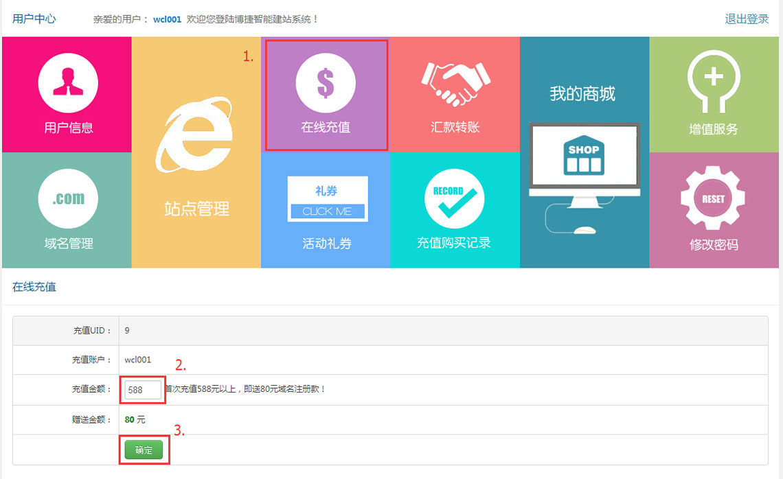 3、选择“在线充值”,输入充值金额,点击确定;