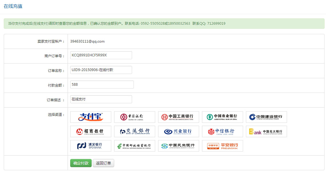 4、确认好您的充值信息无误,选择充值渠道,点击“确定付款”按照提示输入您所选择的支付方式操作,便可充值成功!